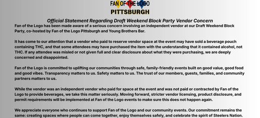 We need to address a critical concern that was brought to our attention following the Draft Weekend Block Party. Fan of the Logo takes the safety, trust, and experience of our members, guests, families, and community partners seriously, and we believe full transparency is necessary.